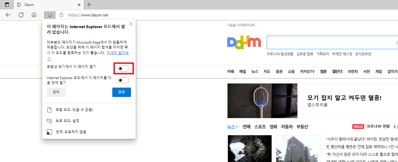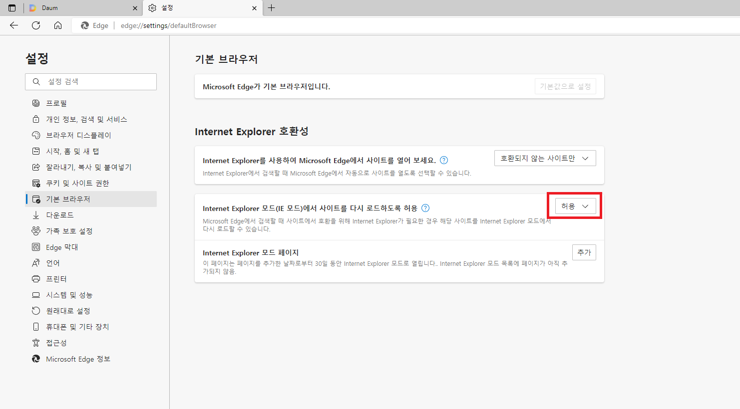 엣지를 익스플로러 모드로 사용하기