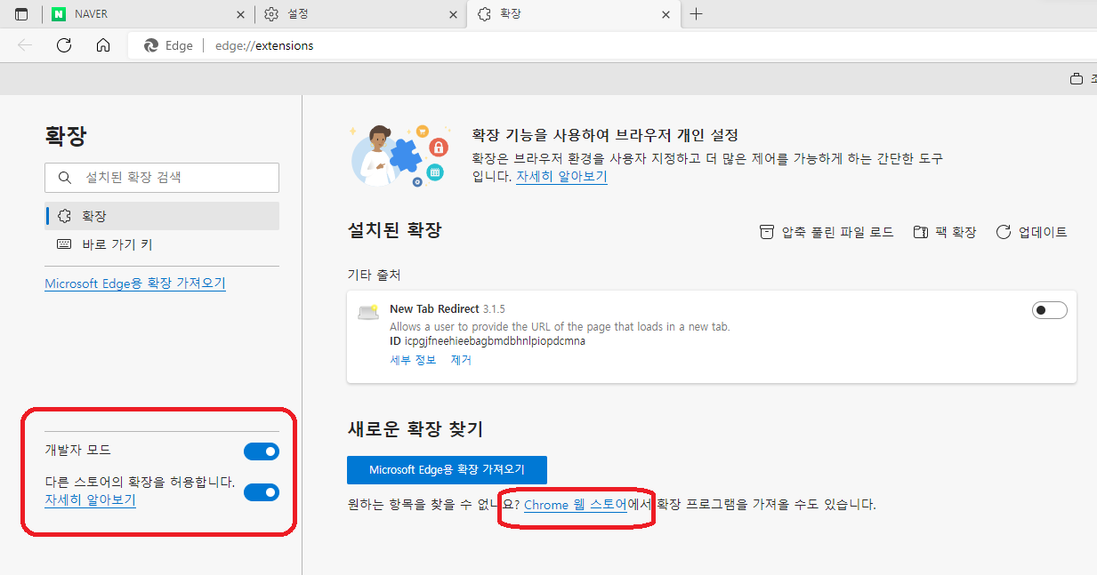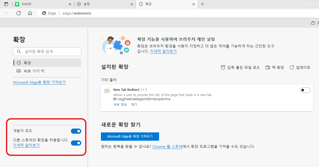 위의 과정만 하고 나면 시작, 홈 및 새 탭 설정에서 따로 안 해줘도 엣지 시작할 때, 홈버튼 눌렀을 때, 새 탭 생성 시 전부 네이버로 시작페이지가 나옵니다.