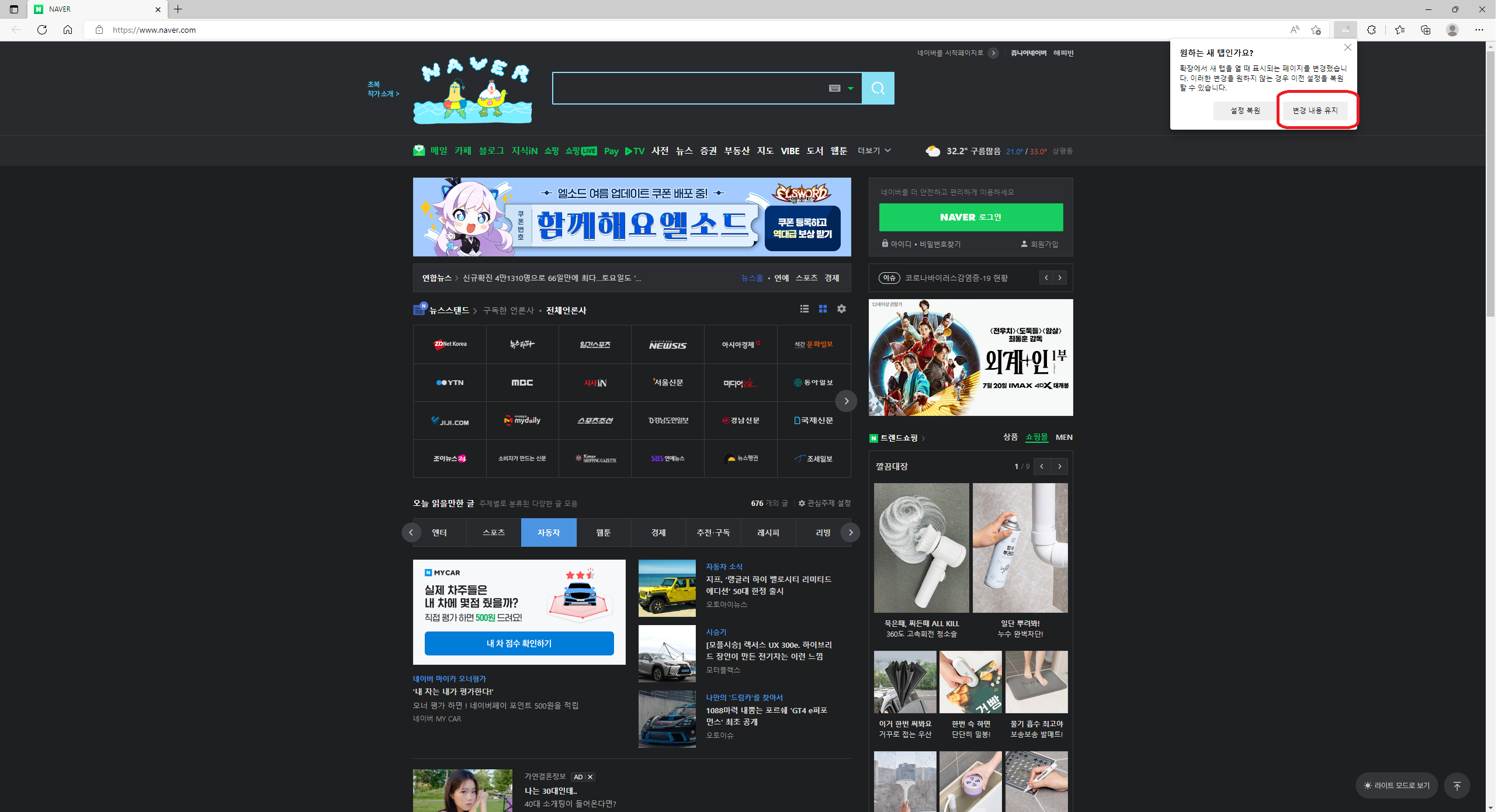 설정 완료 후 우측 상단의 알림이 뜨는데 변경 내용 유지를 눌러주면 앞으로 계속 설정한 페이지가 엣지를 시작할 때나 새 탭을 열 때 시작페이지로 나타나게 됩니다.